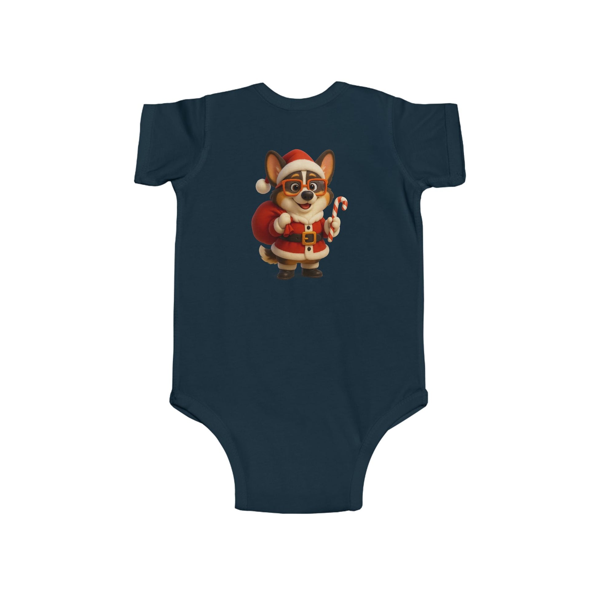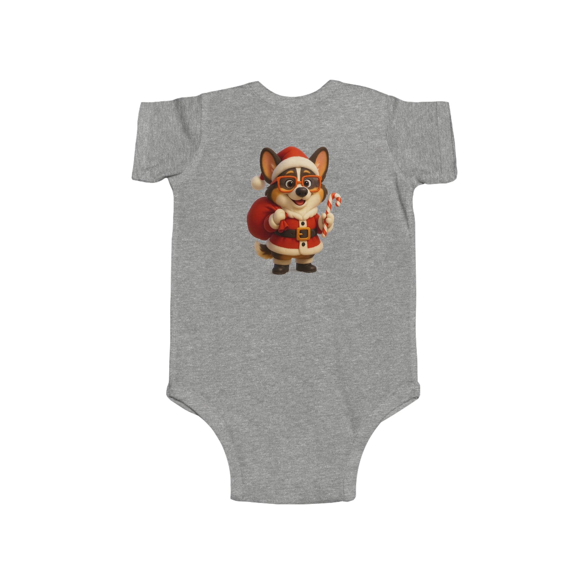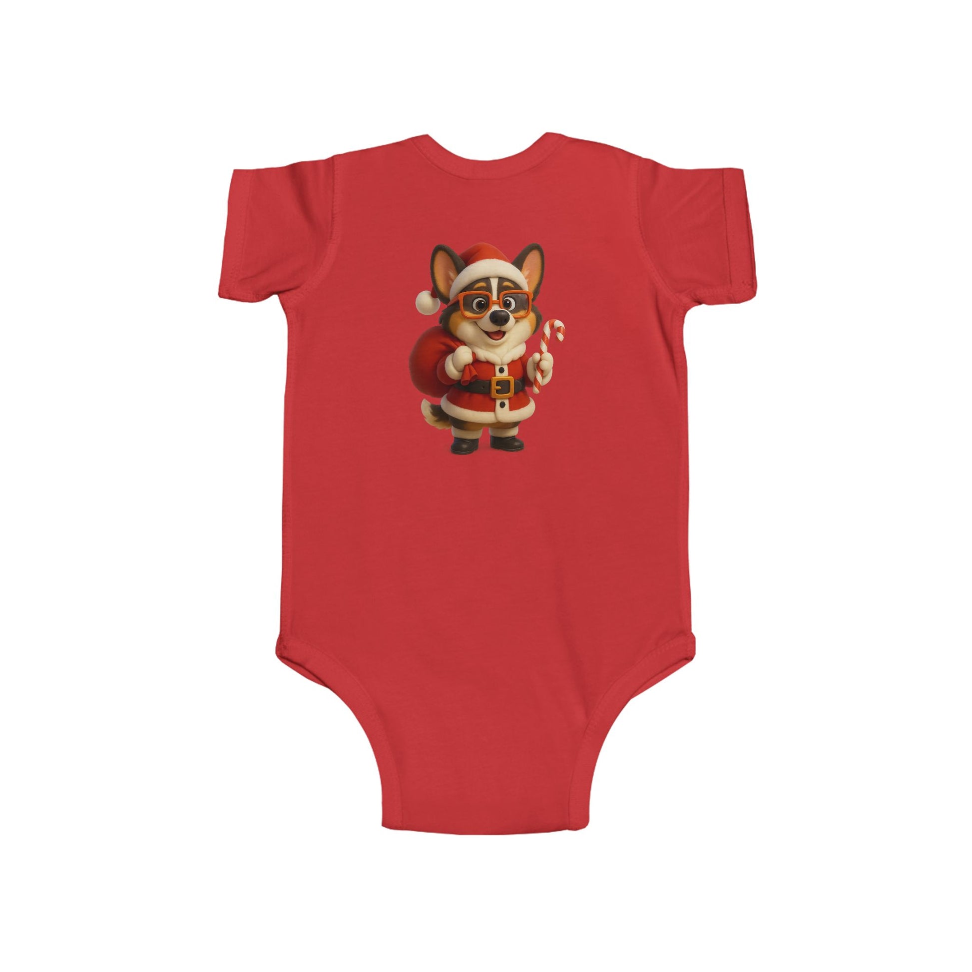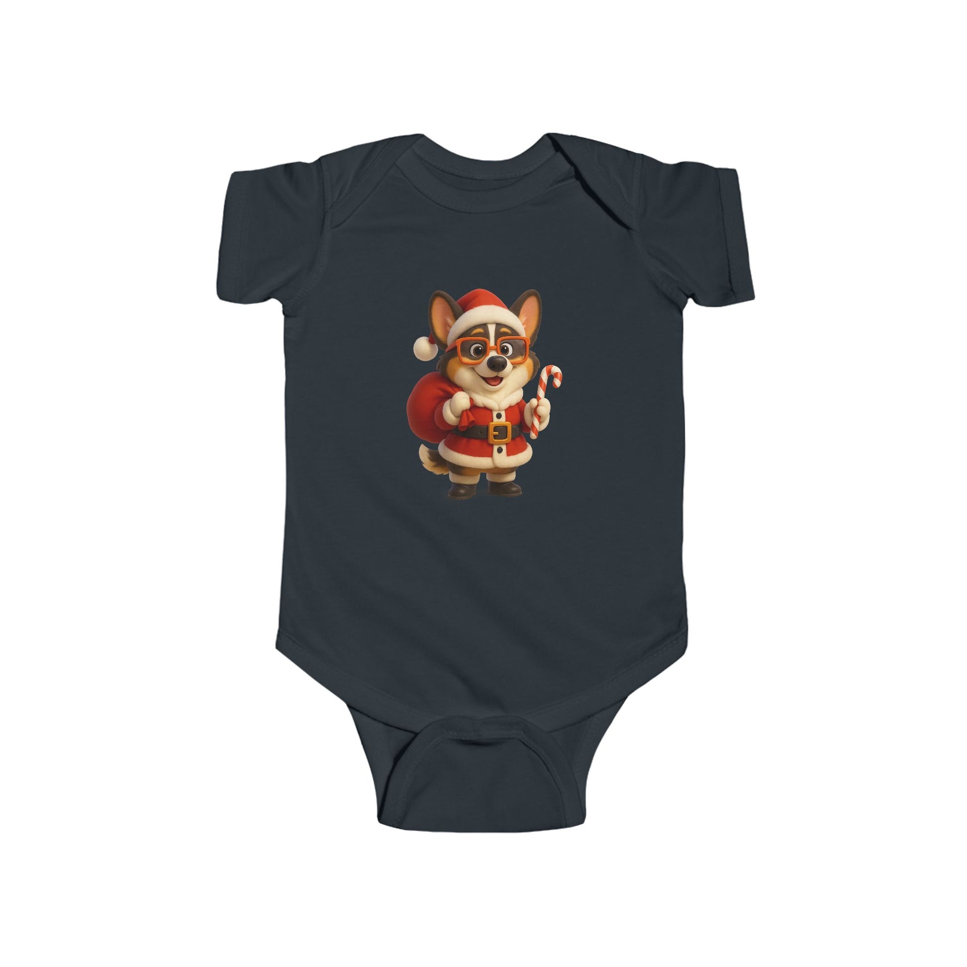 Soft, lightweight infant bodysuit printed with an adorable holiday corgi dressed as Santa — tiny candy cane in paw, rosy cheeks, and a plush red sack. The smooth, combed ringspun fabric feels gentle against delicate skin while ribbed knit binding gives stretch where babies need it most. Side seams keep the shape through washes, and matching snaps at the crotch make quick changes easy. This little onesie brings a cozy, merry touch to winter mornings and family photo moments — imagine cuddles on the couch, tree-trimming chaos, and baby’s first holiday smiles captured in this festive outfit.