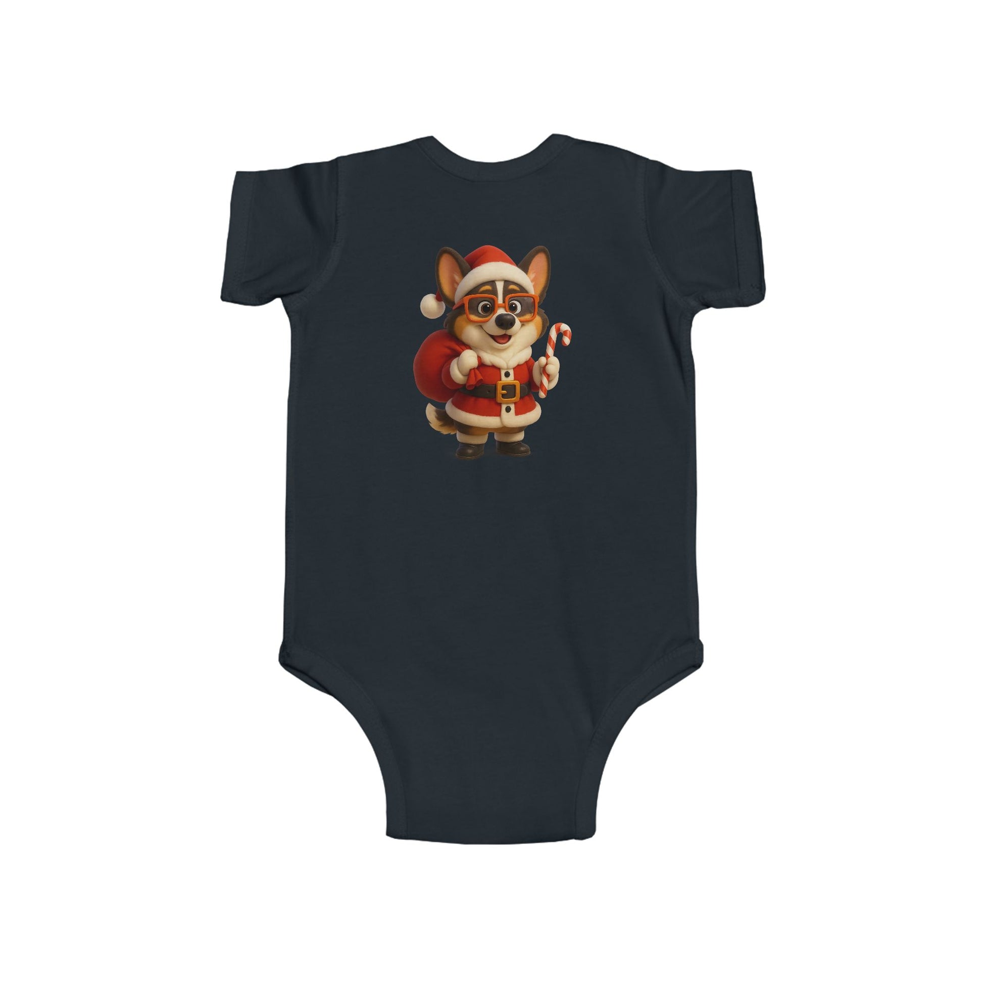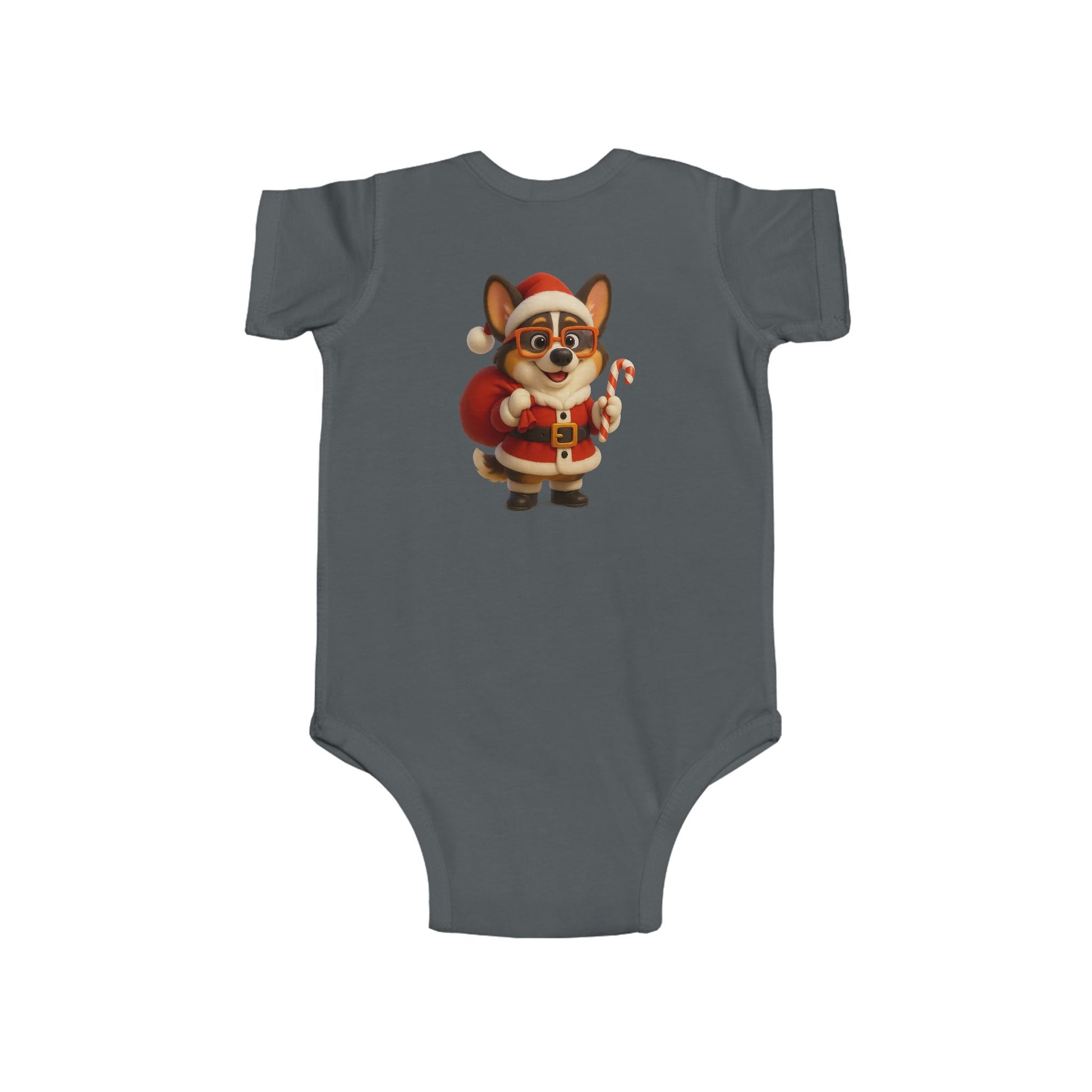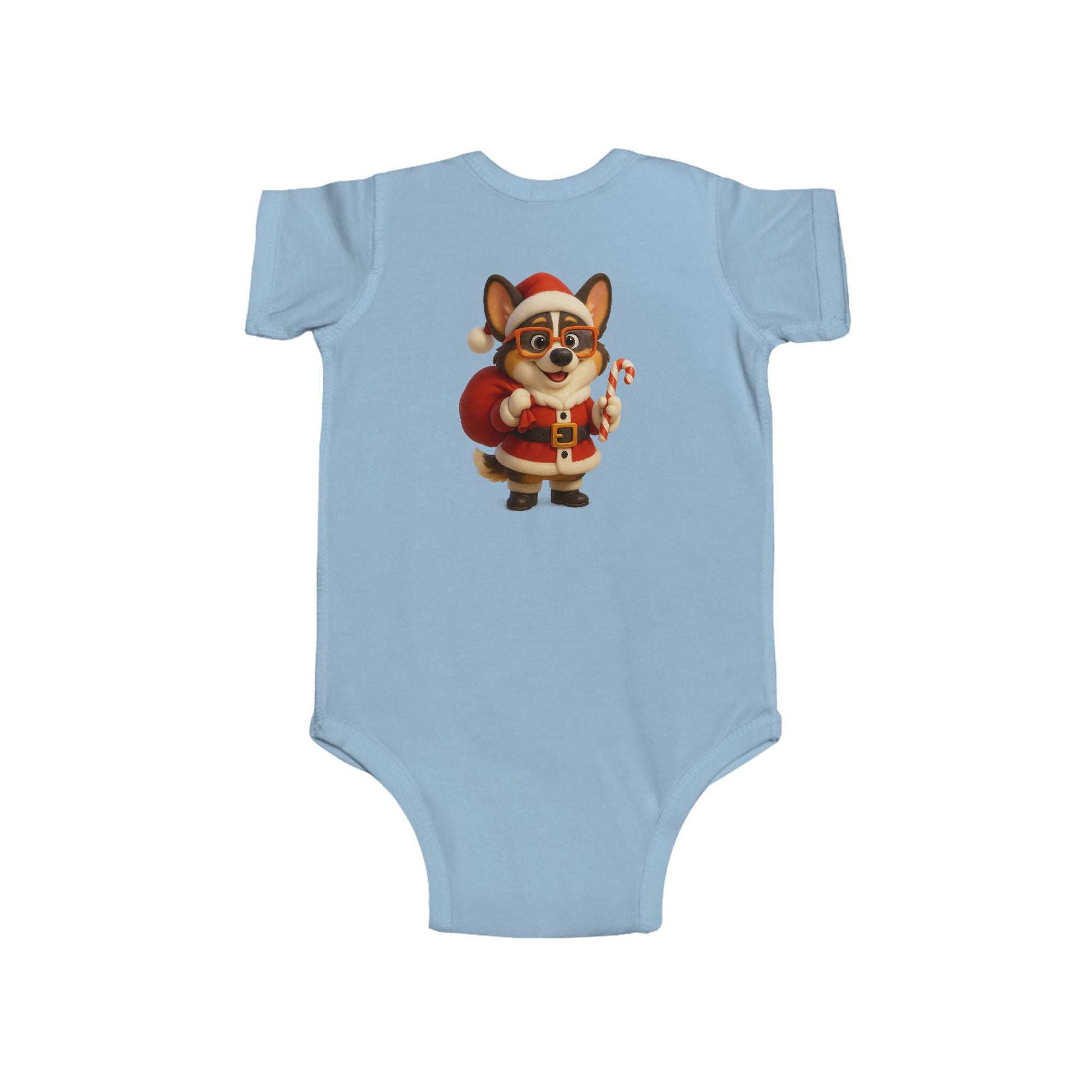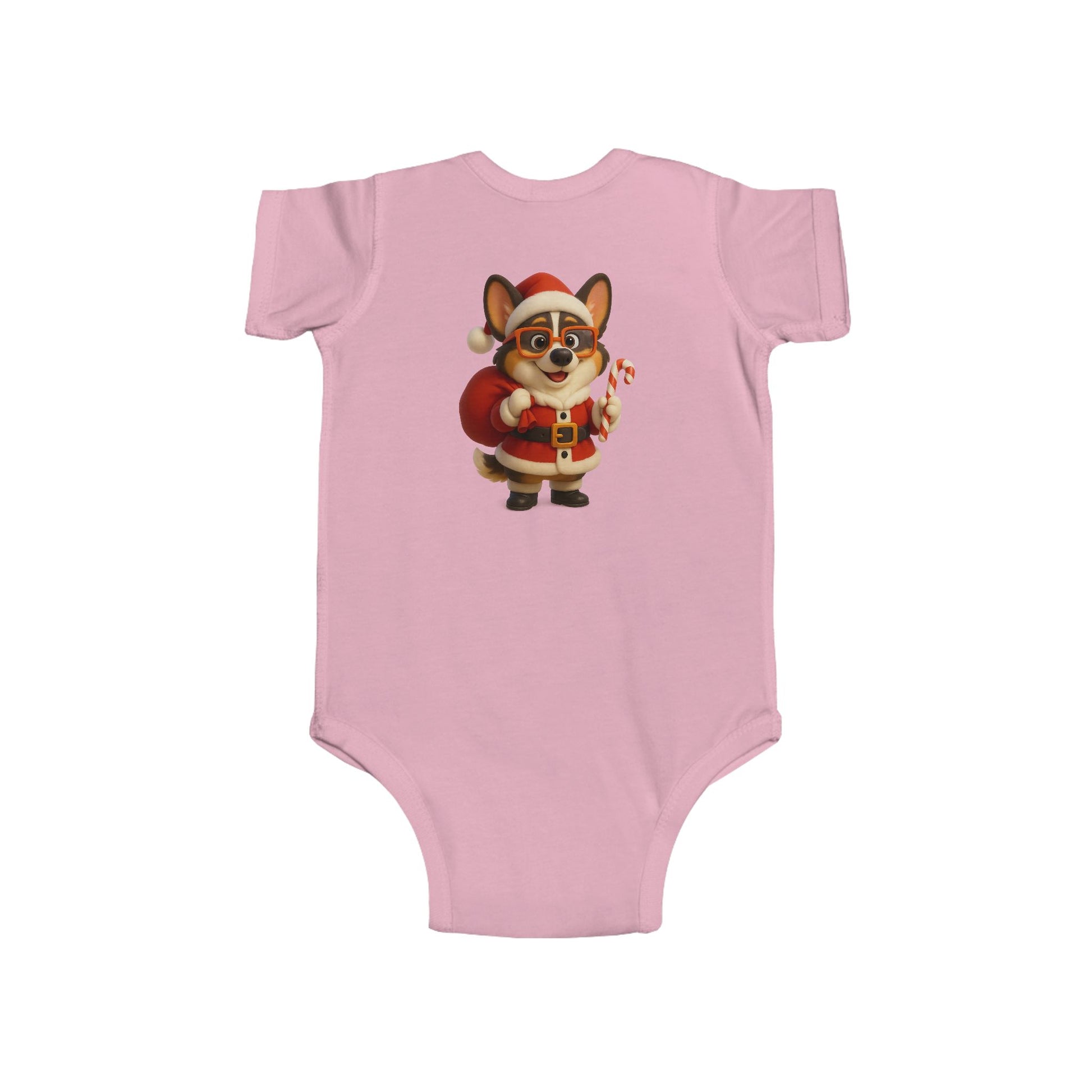 Soft, lightweight infant bodysuit printed with an adorable holiday corgi dressed as Santa — tiny candy cane in paw, rosy cheeks, and a plush red sack. The smooth, combed ringspun fabric feels gentle against delicate skin while ribbed knit binding gives stretch where babies need it most. Side seams keep the shape through washes, and matching snaps at the crotch make quick changes easy. This little onesie brings a cozy, merry touch to winter mornings and family photo moments — imagine cuddles on the couch, tree-trimming chaos, and baby’s first holiday smiles captured in this festive outfit.