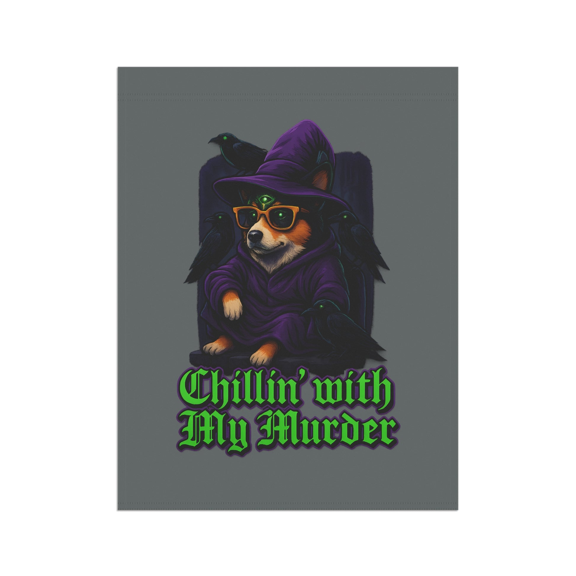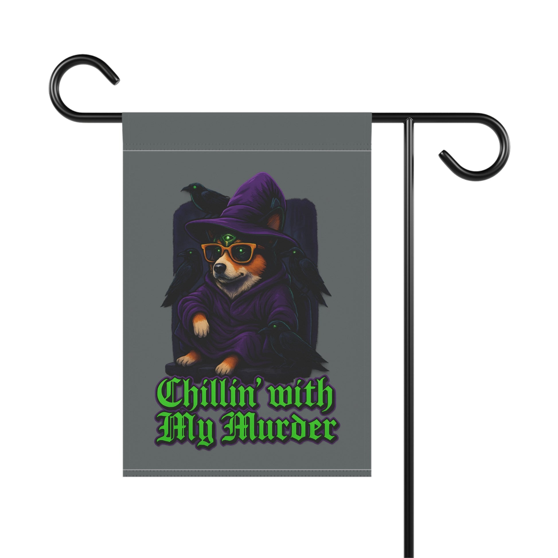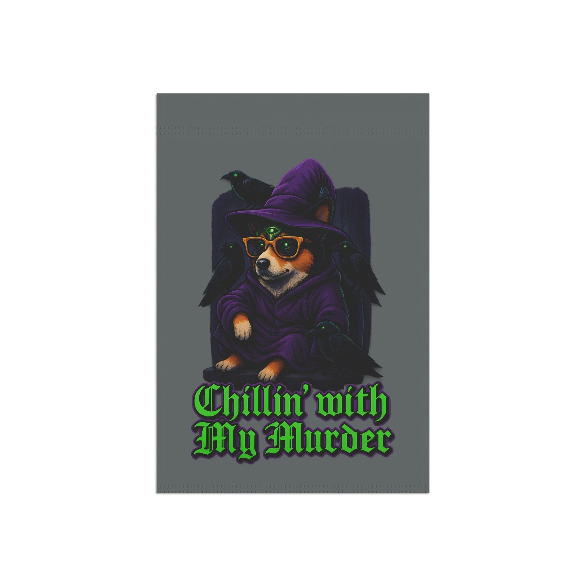 A Halloween Garden Banner featuring a 'Chillin' with My Murder' design, perfect for dog lovers and spooky home decor enthusiasts. This outdoor decoration adds a fun and festive touch to your garden or house, ideal for Halloween celebrations.